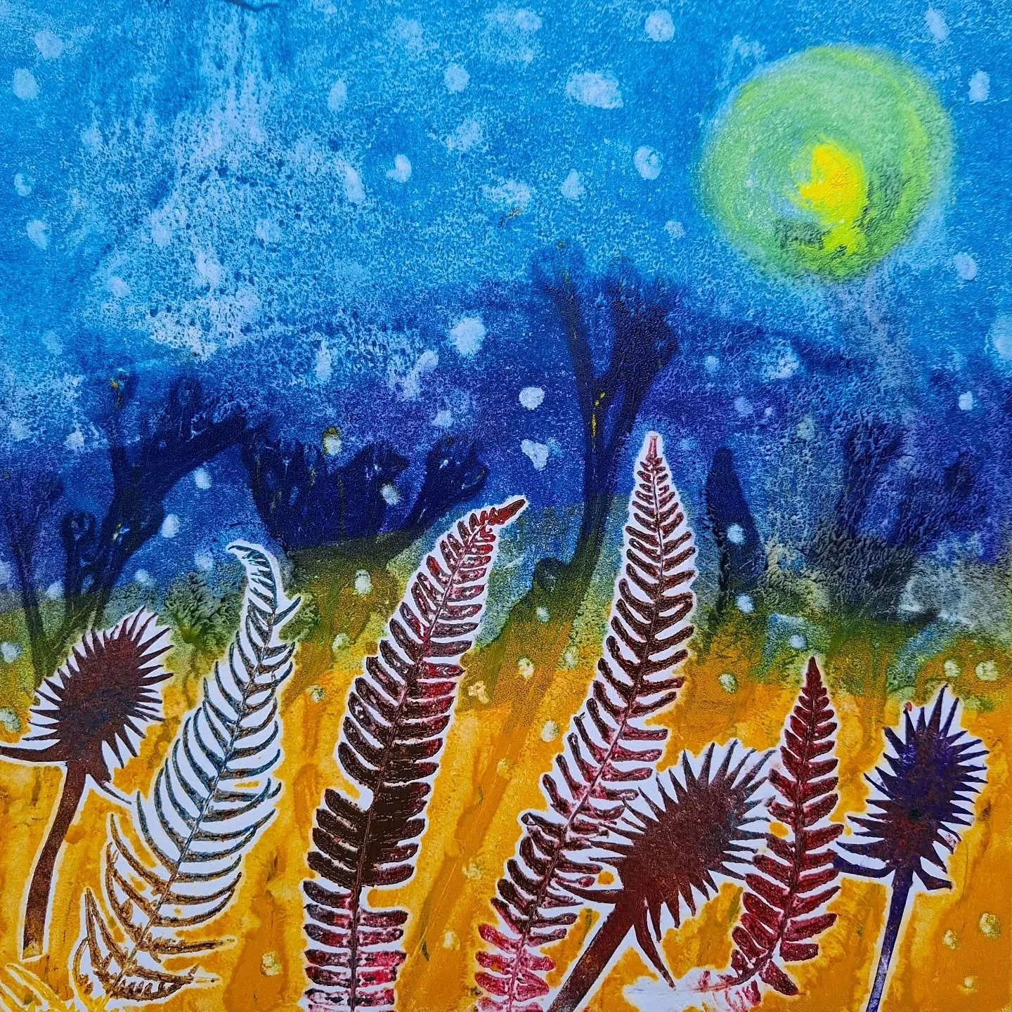 If a painting described as “mixed media” it means that I have had a lot of fun using all kinds of paints, spray cans, pastels, pencils, inks and torn paper to create it. I just use whatever feels right.